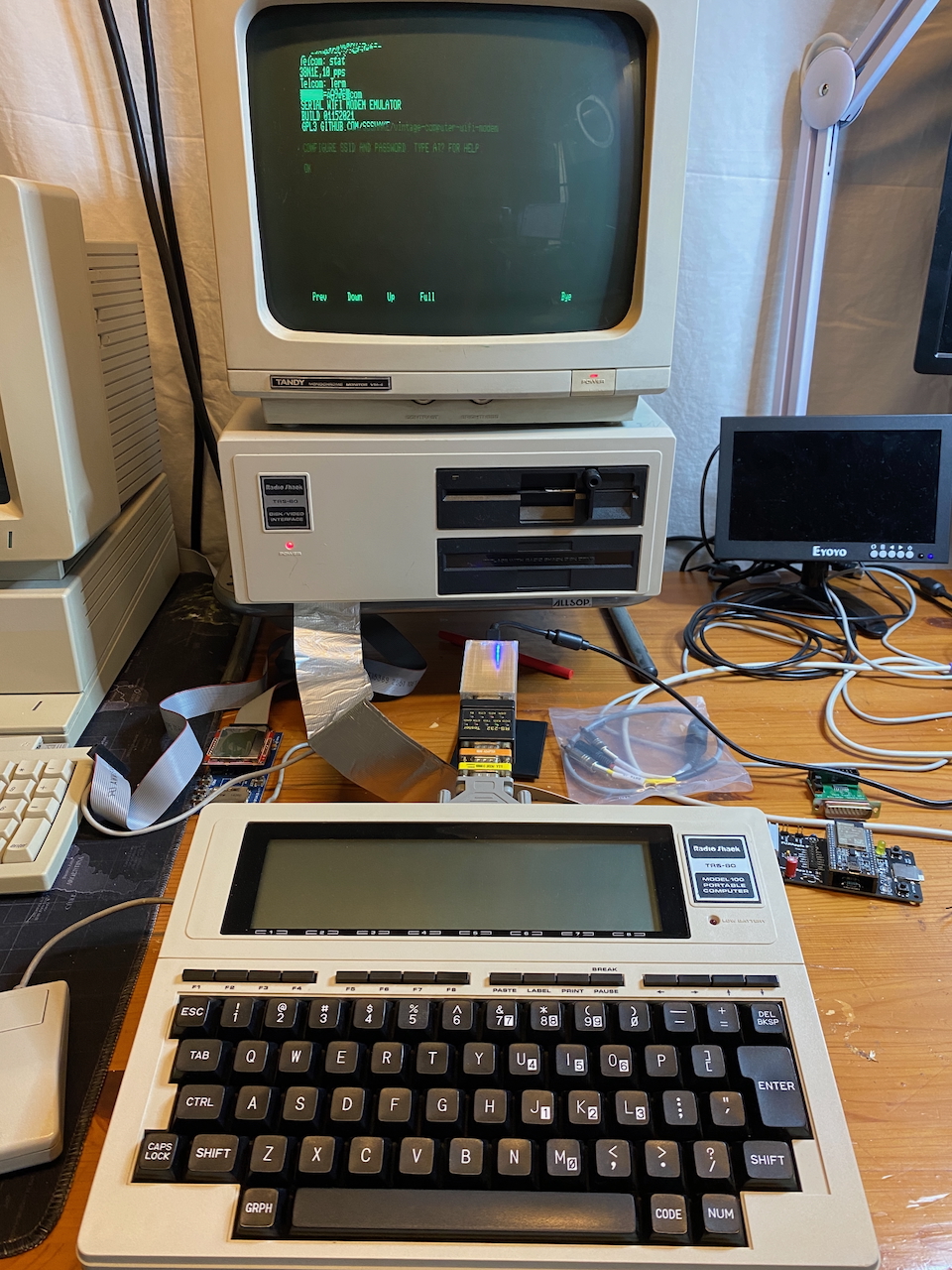 This is for a Tandy M100 portable, plus DVI (disk video interface). Includes cable to connect from the DVI to the M100 and a tandy mono CRT. Note: M100 needs caps at this point and I haven’t re-capped. The DVI seems to be fine.